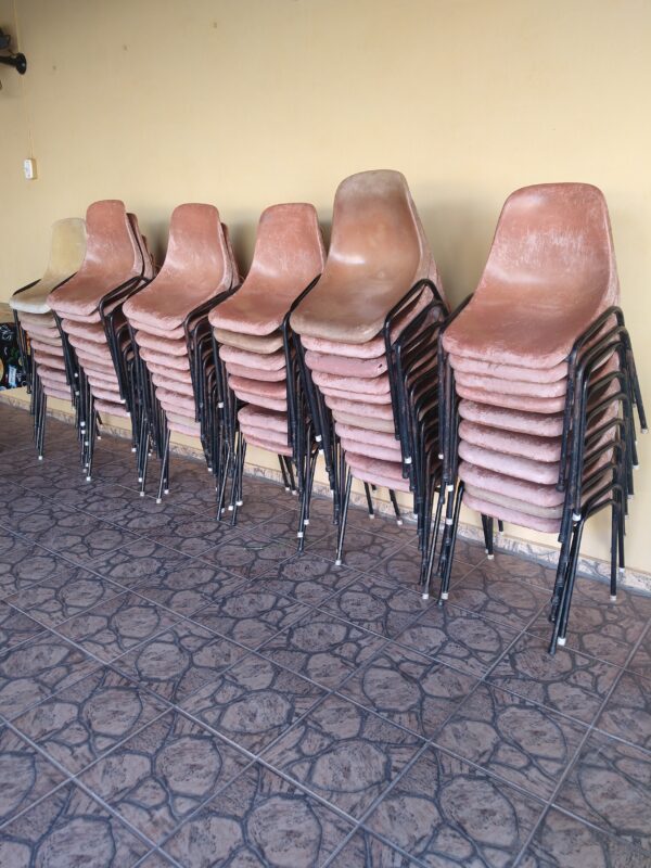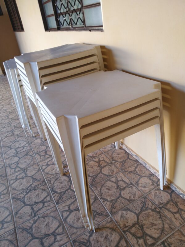 60 cadeiras de plástico e 14 mesas de plástico.